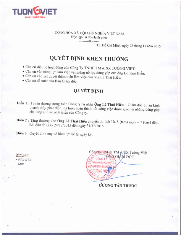 Nhằm tôn vinh cá nhân có thành tích xuất sắc năm 2015, ban lãnh đạo công ty có quyết định khen thưởng theo quy chế công ty đối với ông Lê Thái Hiếu, ông Văn Phú Tấn Bình và ông Nguyễn Quang Hoàng.
