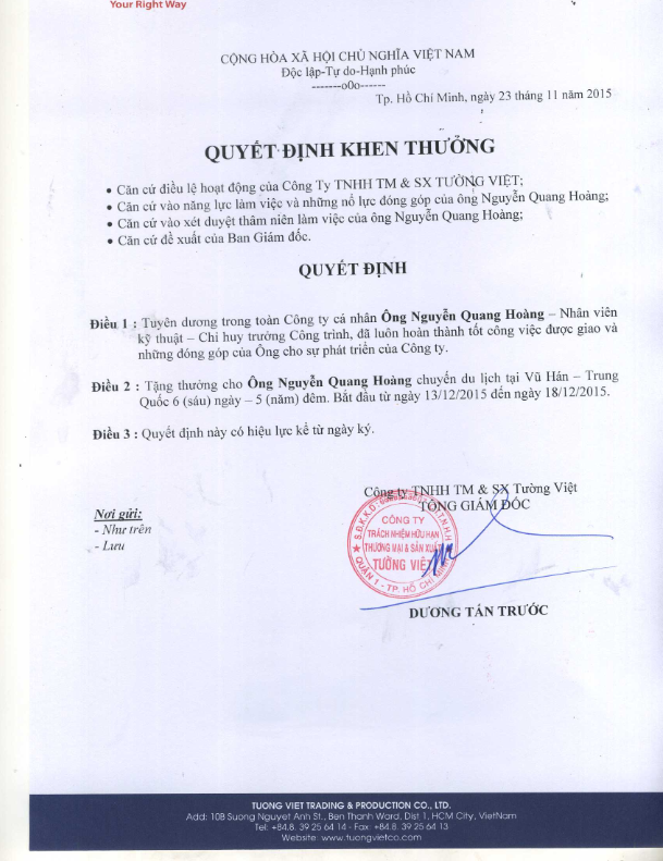 Quyết định khen thưởng nhằm công nhận những đóng góp đối với công ty và thúc đẩy, tạo động lực cho cán bộ công nhân viên luôn nỗ lực hết mình hoàn thành các nhiệm vụ được giao.